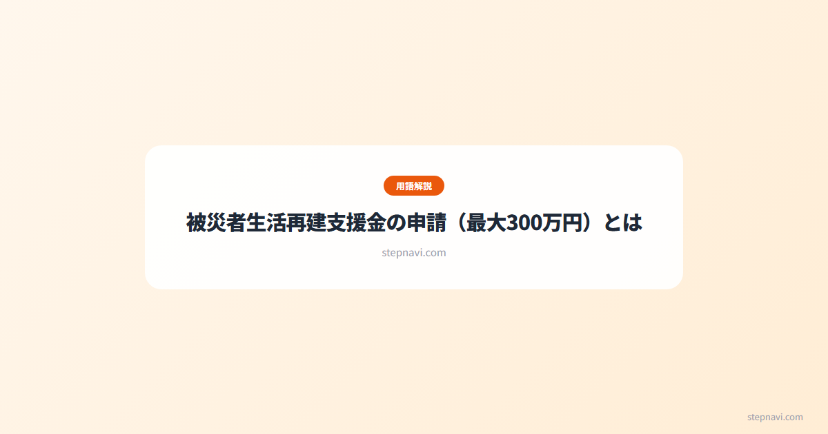 被災者生活再建支援金とは、自然災害で住宅が全壊・大規模半壊・半壊などの被害を受けた世帯に対し、国が生活再建のための資金を支給する制度です。支給額は基礎支援金と加算支援金の合計で最大300万円になります。全壊の場合は基礎支援金100万円に加え、住宅を建設・購入する場合の加算支援金200万円が支給されます。申請先は住所地の市区町村役場で、罹災証明書が必要です。申請期限は基礎支援金が災害発生日から13ヶ月以内、加算支援金が37ヶ月以内です。法的根拠は被災者生活再建支援法第3条です。