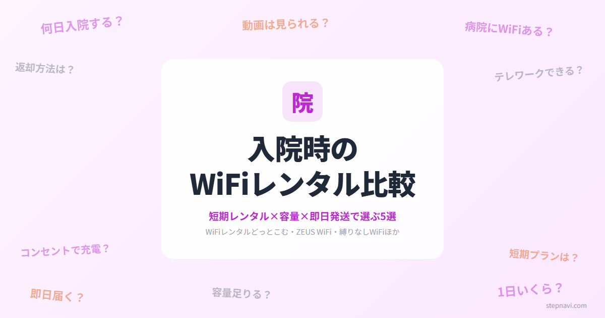 この記事では、短期レンタル対応・大容量・即日発送の3つの軸で、入院時に使えるWiFiレンタル5社を比較します。