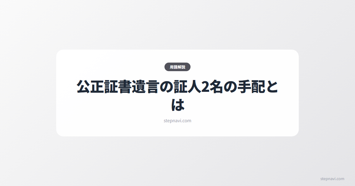 証人2名の手配とは、公正証書遺言を作成する際に必要な証人を確保する手続きです。公正証書遺言には証人2名以上の立会いが法律で義務付けられています。証人には欠格事由があり、推定相続人や受遺者とその家族は証人になれません。法的根拠は民法第969条第1号・第974条です。
